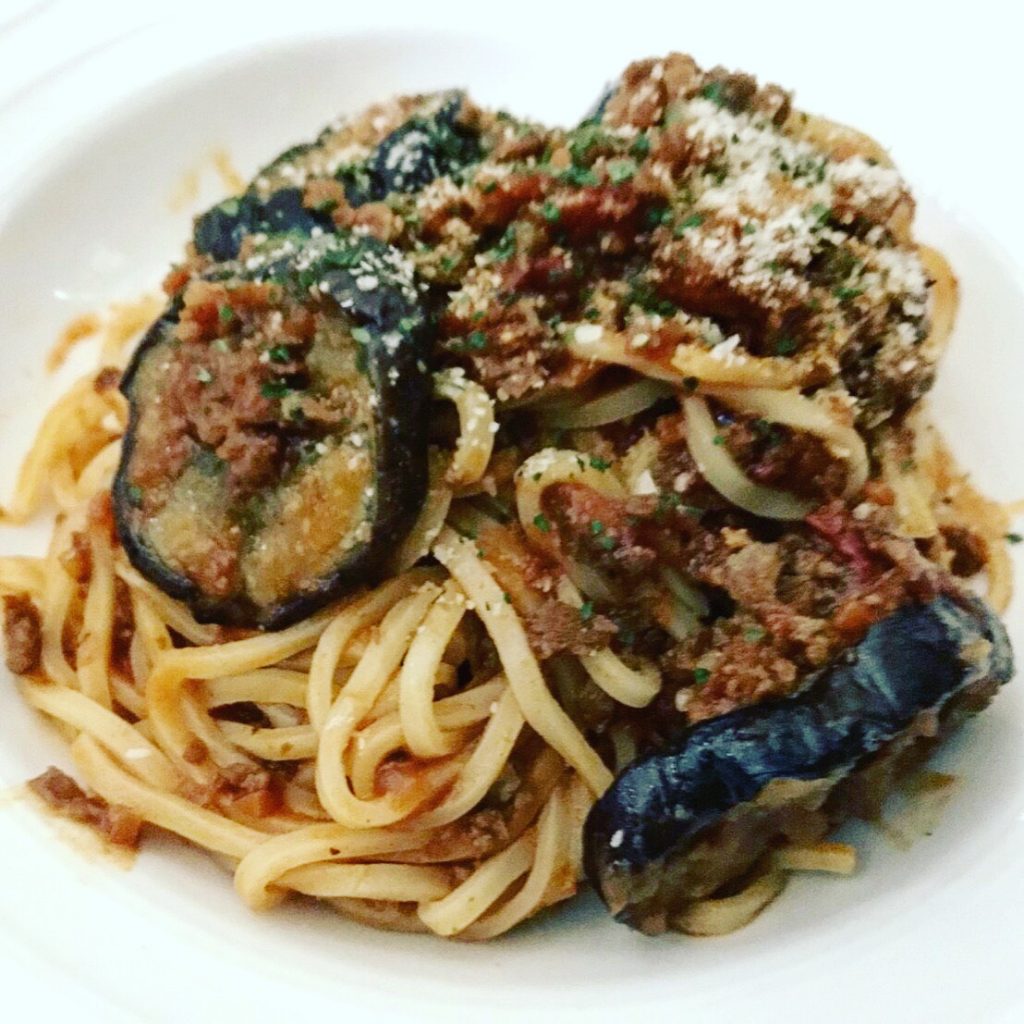 ベルビーのボロネーゼはソースとは別にナスを炒めてから合わせています。