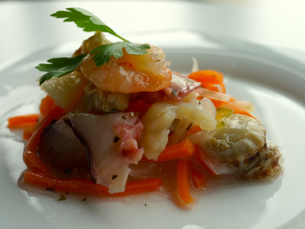 ホタテ、海老、イカ、タコ等をバジルとエストラゴン(よもぎの一種で料理の味を劇的に変化させることから「魔法の竜」と呼ばれている。)でマリネしました。