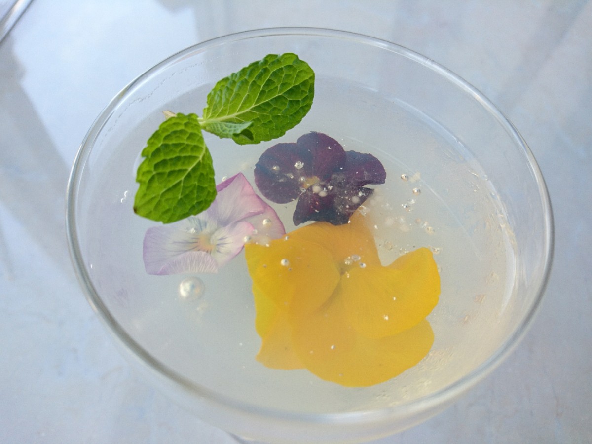 食べられる食用のお花(エディブルフラワー)を閉じ込めた可愛くてほんのり甘い桃のゼリーです 。