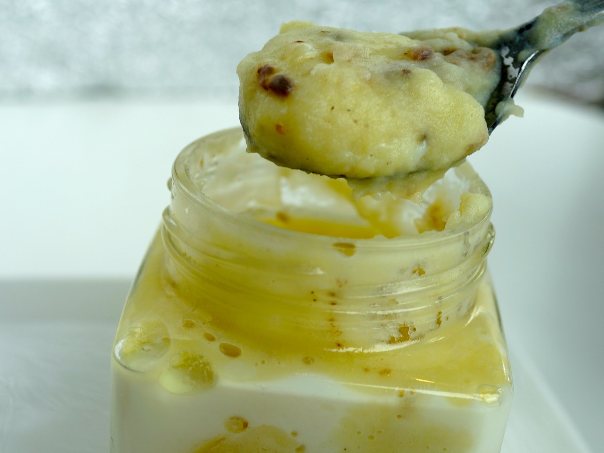 瓶の中にマッシュポテトを入れ、上に生卵を乗せてから茹でる