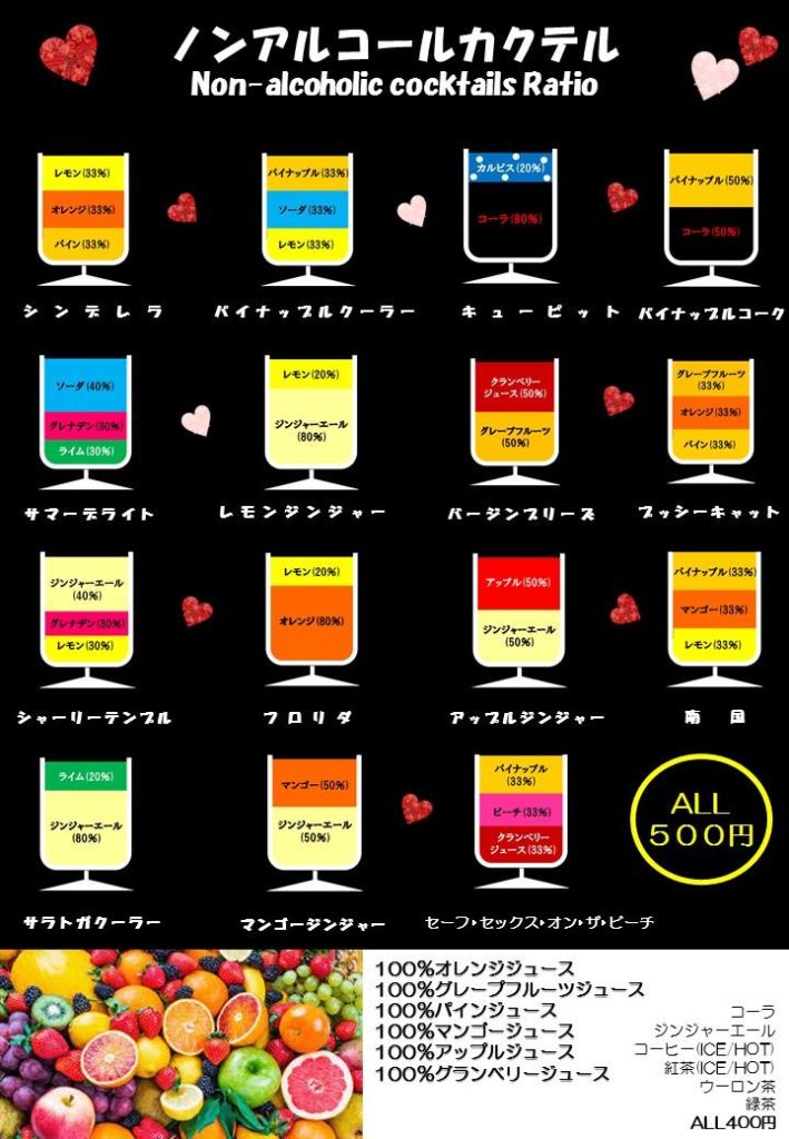 ネオ酒場よねでは女性に人気のあるノンアルコールカクテルを各種取り揃えています。