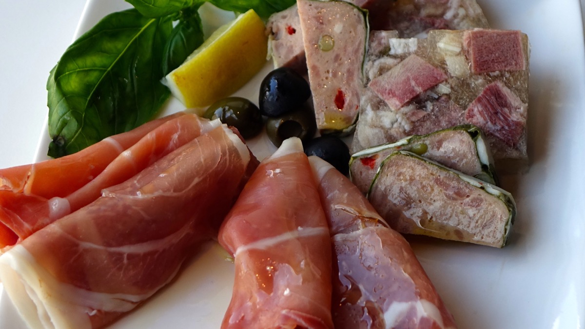オードブル。生ハムはスペイン産ハモンセラーノと、イタリア産プロシュートの食べ比べを。