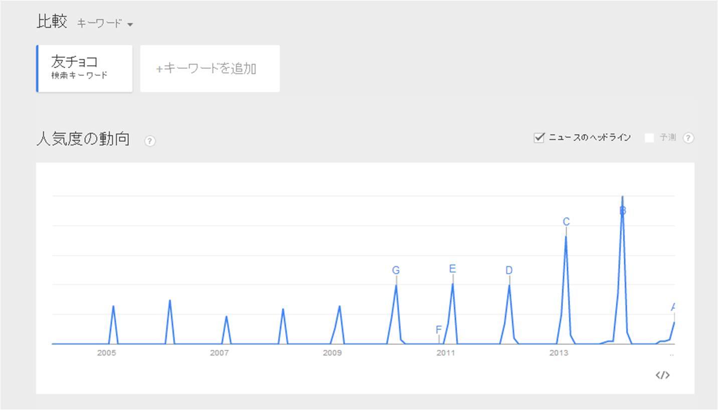また、Googleトレンドというキーワードの検索ニーズがわかるツールで「友チョコ」と検索して調べてみました。